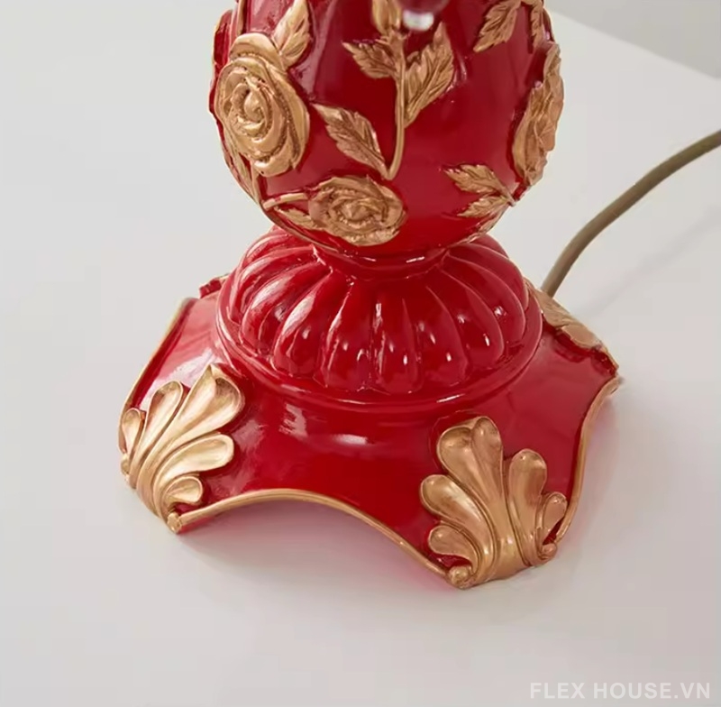 Điểm nổi bật của sản phẩm nằm ở thân đèn resin tạo hình cổ điển, đắp nổi hoa hồng ánh vàng – biểu trưng cho tình yêu trọn vẹn và sự gắn kết. Khi bật sáng, ánh đèn tỏa qua lớp chao vải cho hiệu ứng ánh sáng dịu, không chói, giúp không gian trở nên ấm cúng, dễ chịu và riêng tư. Đây không chỉ là một chiếc đèn trang trí, mà là vật phẩm decor mang ý nghĩa phong thủy, kích hoạt năng lượng hạnh phúc, giúp không gian cưới thêm trọn vẹn và đáng nhớ.