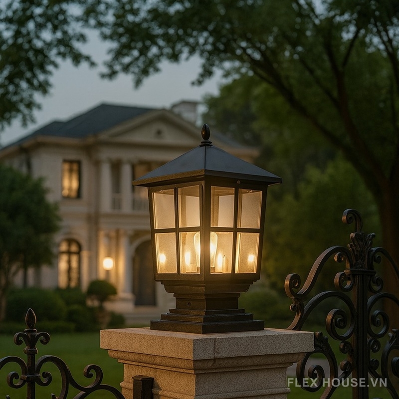 - Kiểu dáng: Đèn trụ cổng vuông cỡ lớn phong cách Tân cổ điển