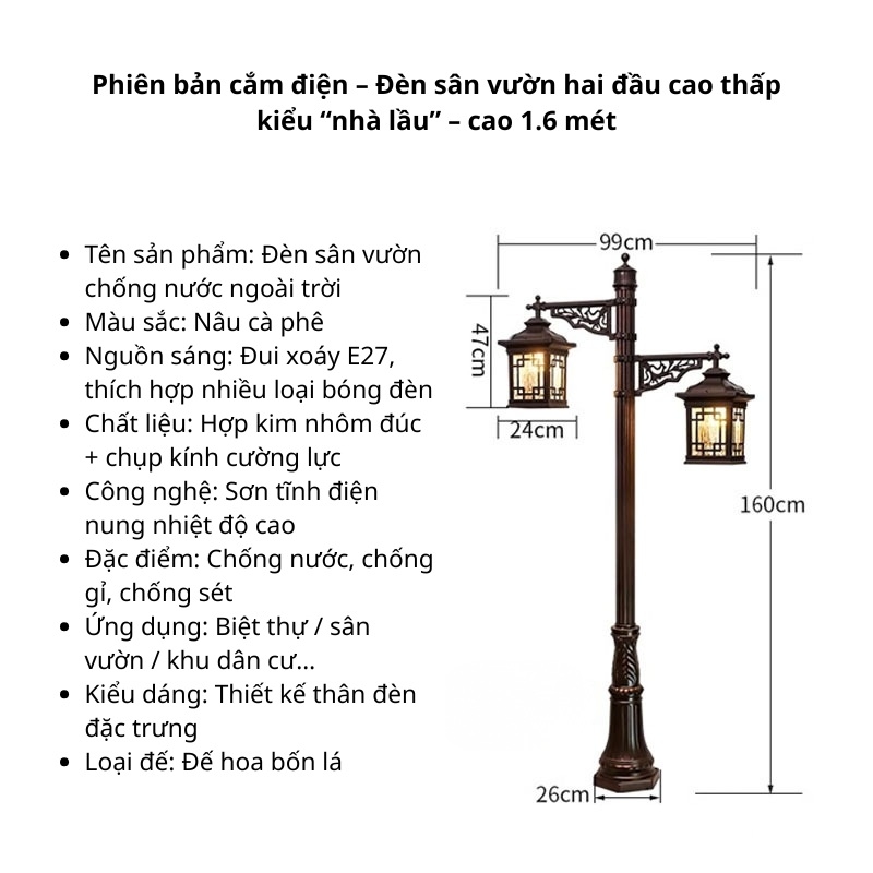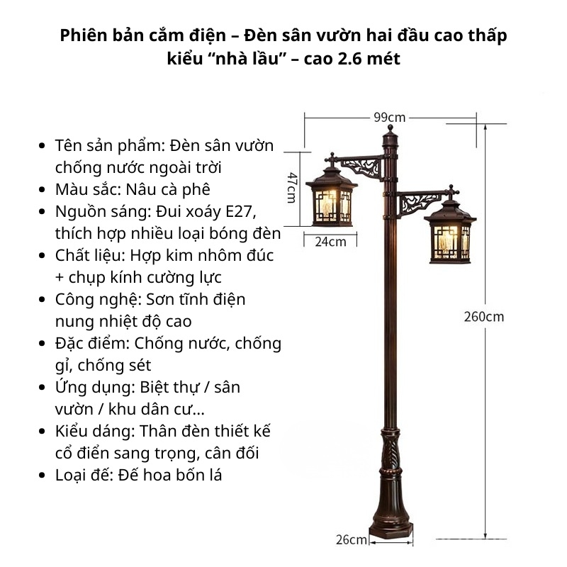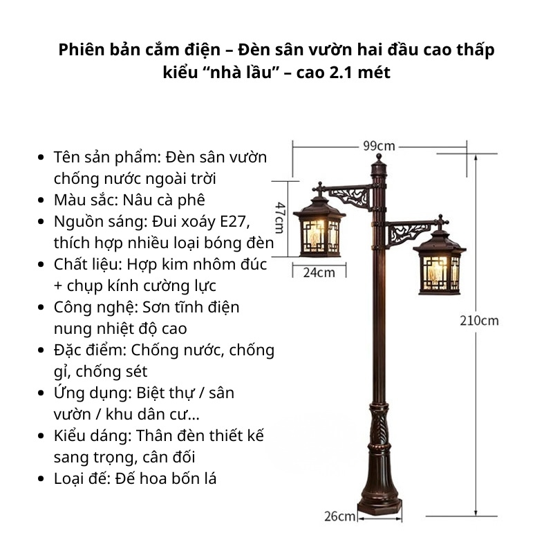 - Chất liệu nhôm đúc sơn tĩnh điện cao cấp chống gỉ, bền màu, chịu được thời tiết khắc nghiệt.