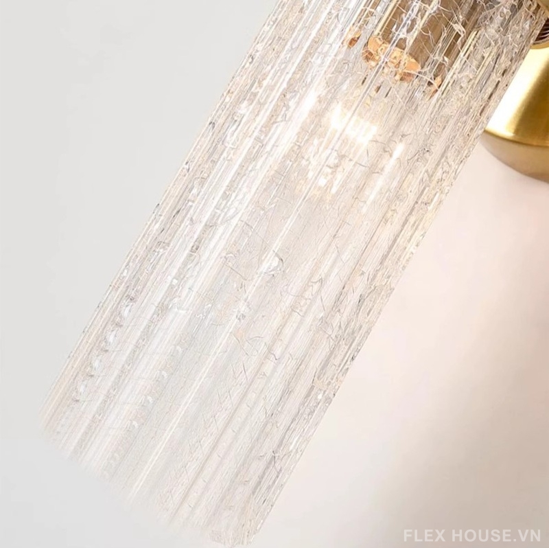Đèn tường RJ7354 gây ấn tượng ngay từ cái nhìn đầu tiên với thiết kế chao thủy tinh vân nứt độc đáo, gợi liên tưởng đến những khối băng trong suốt lấp lánh dưới ánh sáng. Khi đèn được bật lên, từng đường vân nứt phản chiếu và tán xạ ánh sáng một cách tinh tế, tạo nên hiệu ứng ánh sáng lung linh, mang lại chiều sâu và cảm xúc cho không gian.