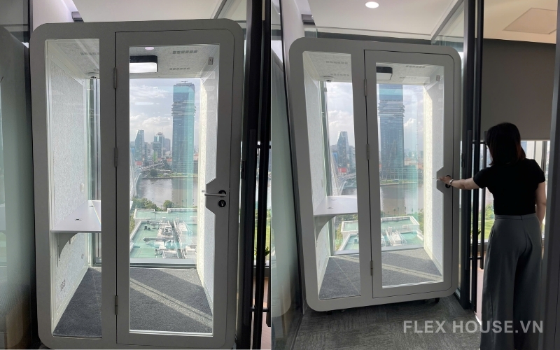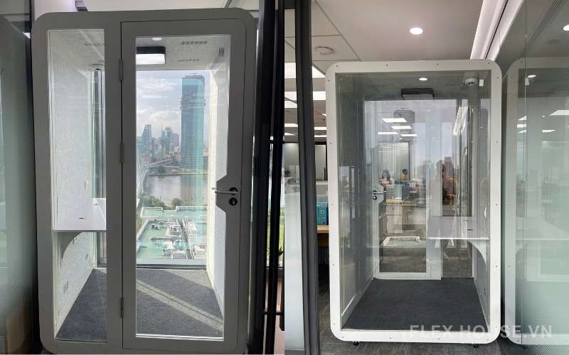 - Song song với việc ngăn tiếng ồn từ ngoài vào, Booth còn có tác dụng cách âm từ trong ra ngoài, đảm bảo tính riêng tư cho người sử dụng và hạn chế ảnh hưởng âm thanh đến khu vực làm việc chung của văn phòng.