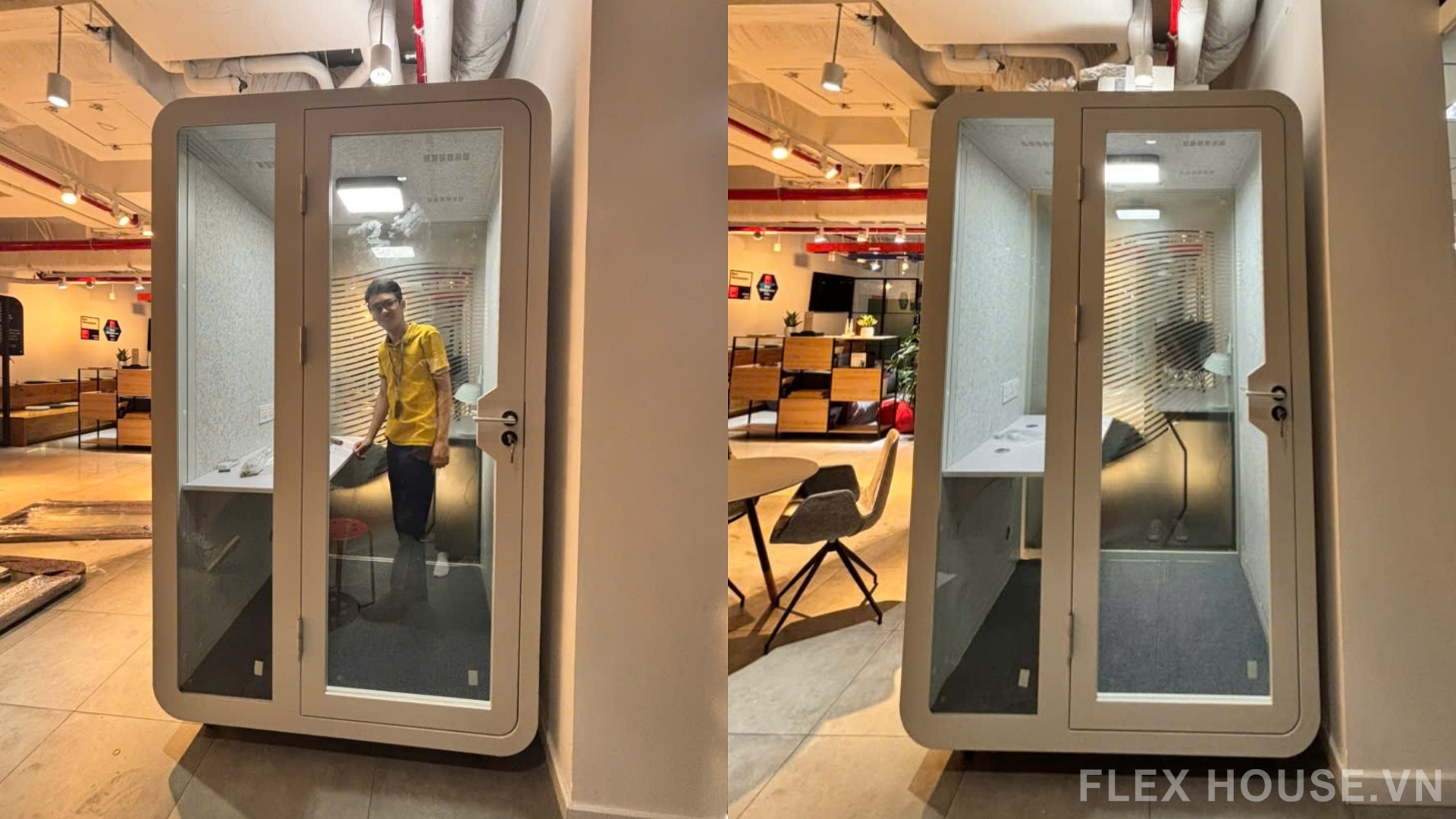 Trước yêu cầu đó, Flexhouse VN đã đề xuất và triển khai Booth cách âm FLS.BLF01, giúp doanh nghiệp chủ động tạo thêm không gian làm việc tập trung ngay trong văn phòng, không cần can thiệp xây dựng cố định.