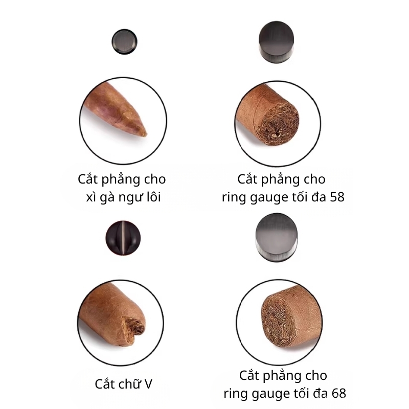 - 4 lưỡi cắt sắc bén: Hỗ trợ nhiều kiểu cắt (cắt phẳng, V-cut), phù hợp đa dạng kích thước xì gà (ring ≤ 68)