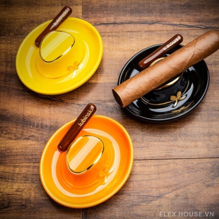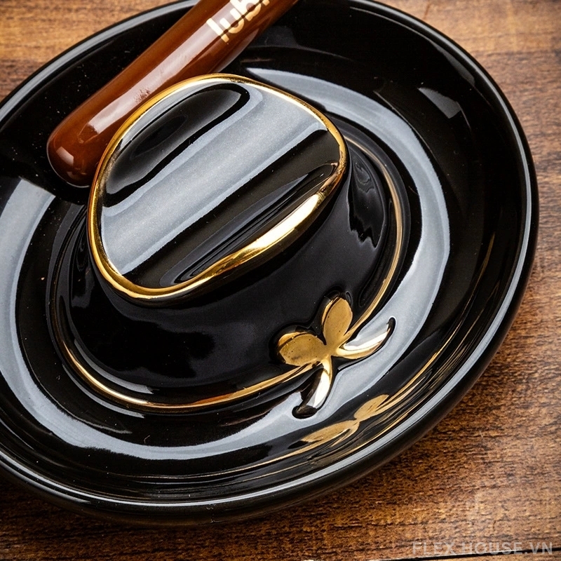 Gạt tàn được chế tác từ gốm sứ cao cấp, phủ men bóng mịn và viền nhũ ánh kim sang trọng, không chỉ đẹp về thẩm mỹ mà còn đảm bảo độ bền và khả năng chịu nhiệt tốt khi sử dụng với cigar. Kiểu dáng nguyên khối, lòng gạt sâu cùng rãnh kê cigar rộng giúp giữ điếu ổn định, mang lại trải nghiệm thưởng thức cigar trọn vẹn và thoải mái hơn.