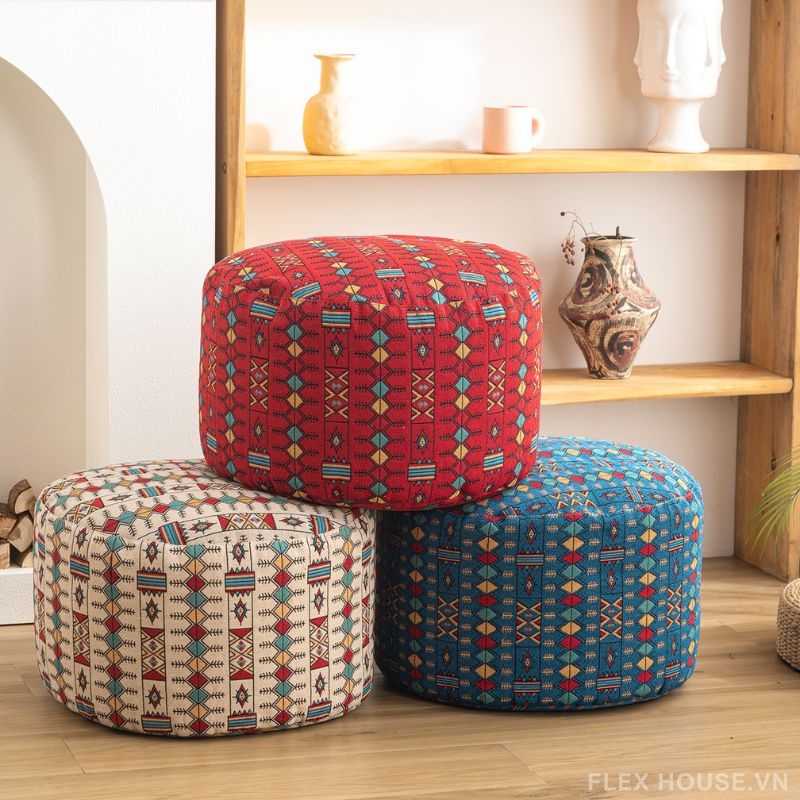Ghế đôn họa tiết du mục đa màu DF9220 thiết kế dáng tròn thấp, form mềm; bọc vải polyester cotton dệt chắc, thoáng và thân thiện với da. Bên trong sử dụng hạt xốp EPP an toàn, nhẹ, đàn hồi tốt, bảo vệ môi trường, không gây kích ứng hay hại da khi tiếp xúc lâu. Họa tiết du mục đa sắc nổi bật, mang cảm hứng thủ công và tự do.