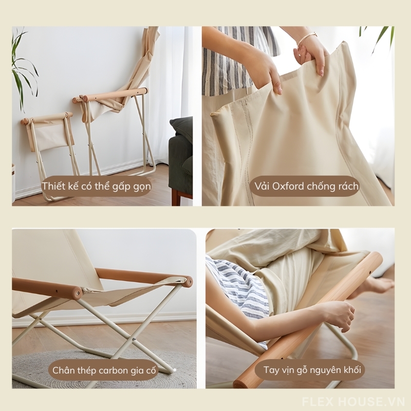Ghế xếp thư giãn HJ0625 ghi điểm mạnh với khung thép carbon cực kỳ chắc chắn, chịu lực tốt và độ bền cao theo thời gian, kết hợp tay vịn gỗ mang lại cảm giác sang trọng và thoải mái khi sử dụng. Phần vải Oxford dày dặn, thoáng khí giúp ngồi lâu không bí bách, đồng thời thiết kế gấp gọn linh hoạt giúp tiết kiệm diện tích tối đa và dễ dàng mang theo mọi nơi.