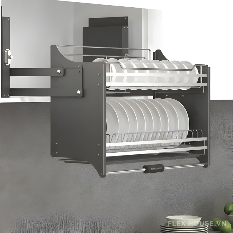 - Cơ chế nâng hạ thông minh: Dễ dàng kéo xuống – đẩy lên nhẹ nhàng, giúp lấy và cất bát đĩa thuận tiện, an toàn, không cần với tay cao.