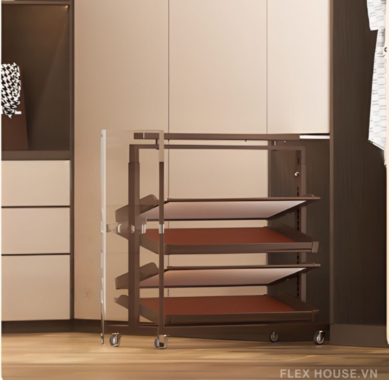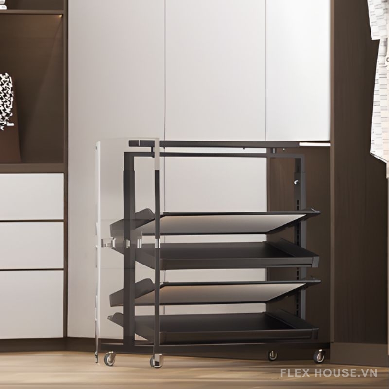 Nếu bạn đang tìm một giải pháp để giày dép luôn gọn gàng, tiện di chuyển và dễ lấy trong mọi tình huống, thì giá để giày YHF2514 chắc chắn sẽ khiến bạn hài lòng ngay từ lần đầu thấy. Thiết kế 4 tầng thoáng, khoa học, giúp sắp xếp từ giày thể thao, sandal đến giày cao gót một cách trật tự. Điểm cộng lớn nhất là bánh xe xoay linh hoạt, cho phép bạn kéo – đẩy – thay đổi vị trí chỉ bằng một thao tác nhẹ, cực kỳ tiện cho phòng nhỏ hoặc những góc khó tiếp cận. Khung sản phẩm được làm từ hợp kim thép chắc chắn, phủ lớp hoàn thiện tinh tế, giúp chiếc kệ vừa bền, vừa mang cảm giác sang – sạch trong không gian sống.