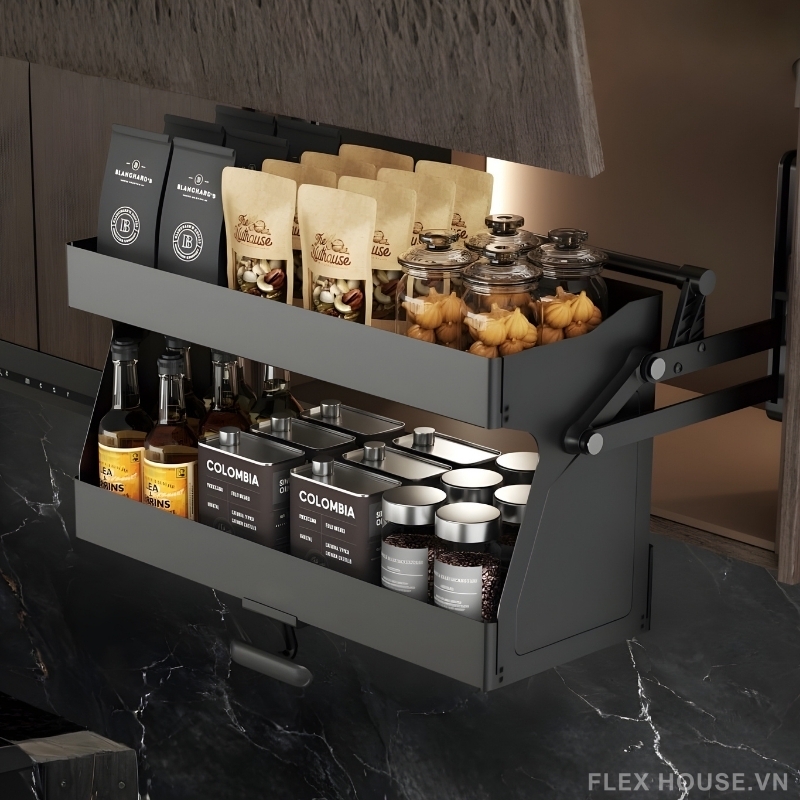 Giá nâng hạ 71362 với thiết kế 2 tầng rộng rãi cho phép lưu trữ đồng thời gia vị, chai lọ, thực phẩm khô hoặc đồ đóng hộp một cách gọn gàng, khoa học. Kết cấu thép chắc chắn kết hợp bề mặt phủ nano cao cấp không chỉ tăng độ bền mà còn nâng tầm thẩm mỹ cho không gian bếp hiện đại.