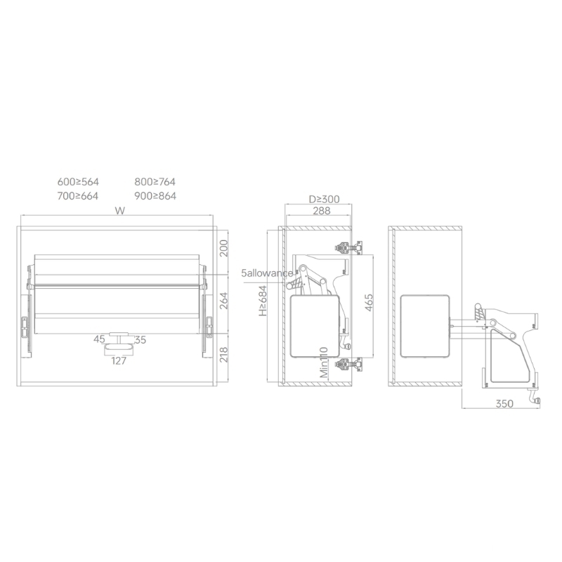 - Khoảng hở tối thiểu đáy cơ cấu đến đáy tủ: ≥110mm