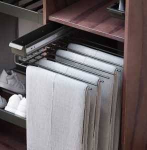 Giá treo quần âm tủ ray giảm chấn Taura SV13 là sự lựa chọn tiện ích cao và là phụ kiện không thể thiếu trong thiết kế các tủ quần áo cao cấp. Trang bị giá treo quần âu với nhiều nan này mang đến sức chứa các bộ quần không thể tin được với 10 thanh treo chứa được 10 bộ quần âu.