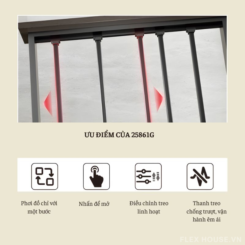 Nhờ vậy, giá treo quần âu 25861G giúp việc phơi đồ trở nên nhẹ nhàng và “vô hình” hơn trong sinh hoạt hằng ngày. Quần áo được treo gọn, không ồn, không lộn xộn, không chiếm diện tích; khi không dùng thì không gian vẫn sạch sẽ, tối gin và sang. Một chi tiết nhỏ nhưng tạo cảm giác sống ngăn nắp, thư thái và đúng chất căn hộ hiện đại.