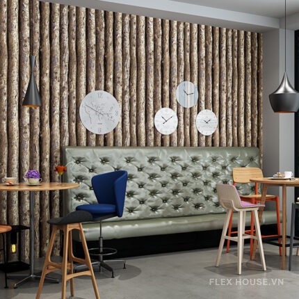 Được thiết kế bề mặt họa tiết giả thân gỗ sống động và chân thực. Với công nghệ in ấn 3D tiên tiến, từng đường vân gỗ được tái hiện một cách tinh tế, mang lại cảm giác ấm cúng và gần gũi như gỗ tự nhiên. Không gian quán cafe của bạn sẽ trở nên độc đáo và đậm chất nghệ thuật hơn bao giờ hết. Dù bạn muốn tạo phong cách vintage hoài cổ hay hiện đại tối giản, mẫu giấy dán tường này đều dễ dàng đáp ứng, biến mọi ý tưởng của bạn thành hiện thực.