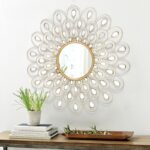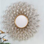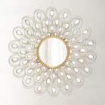 Gương treo tường trang trí phòng khách DQH2546 được làm bằng thủy tinh tráng gương tròn được bao quanh bởi nhiều gương acrylic nhỏ hơn trông giống như một bông hoa hướng dương. Bao quanh gương là khung kim loại thủ công với lá vàng làm nổi bật thiết kế hoa và tăng thêm vẻ sang trọng cho gương. Là sản phẩm trang trí được sử dụng rộng rãi trong không gian nội thất gia đình. Với ưu điểm vượt trội gương còn có thể tận dụng tối đa ánh sáng tự nhiên và phản chiếu tạo không gian rộng mở thoáng mát.