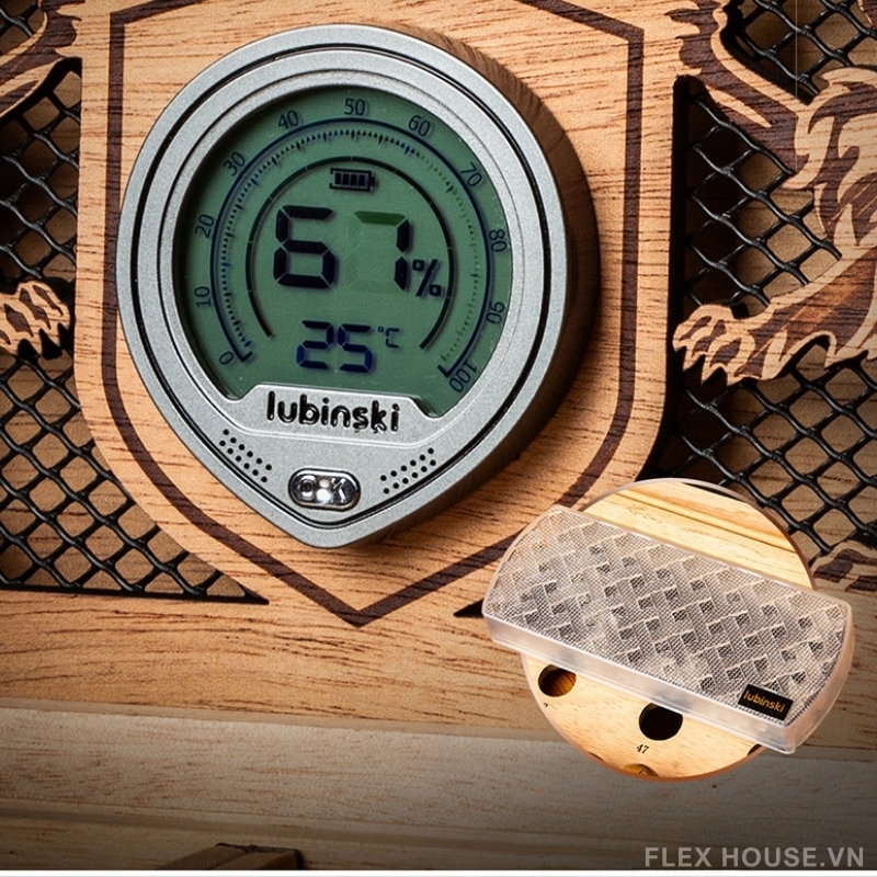 Bên trong vẻ ngoài đầy uy lực ấy là một hệ thống bảo quản được thiết kế chuẩn mực: gỗ tuyết tùng tự nhiên, kết cấu hai tầng khoa học, kết hợp điện tử đo nhiệt – ẩm chính xác và bộ tạo ẩm gel polymer giúp duy trì môi trường lý tưởng cho xì gà trong thời gian dài. Hộp đựng cigar LBS5649 sinh ra để trở thành “ngôi nhà lý tưởng” cho những điếu cigar giá trị – nơi hương vị được nuôi dưỡng và thăng hoa theo thời gian.