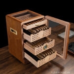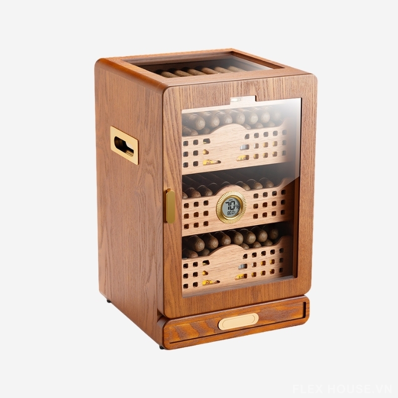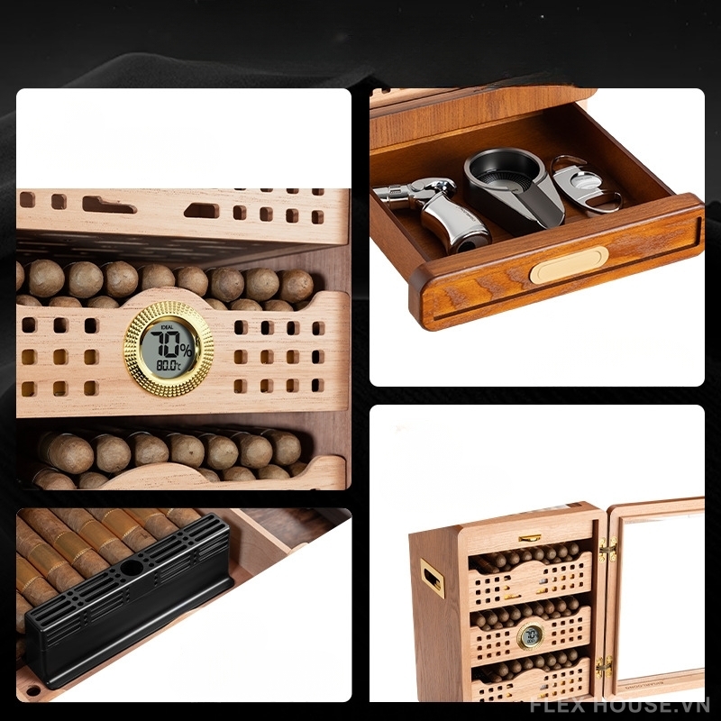 - Khay gỗ thông thoáng: hỗ trợ lưu thông không khí, giúp cigar ổn định chất lượng