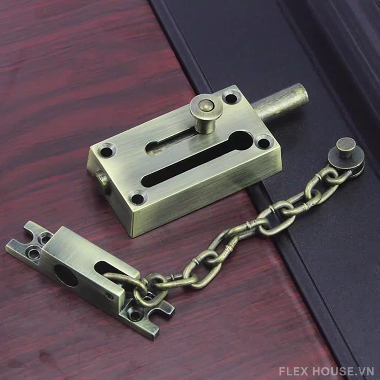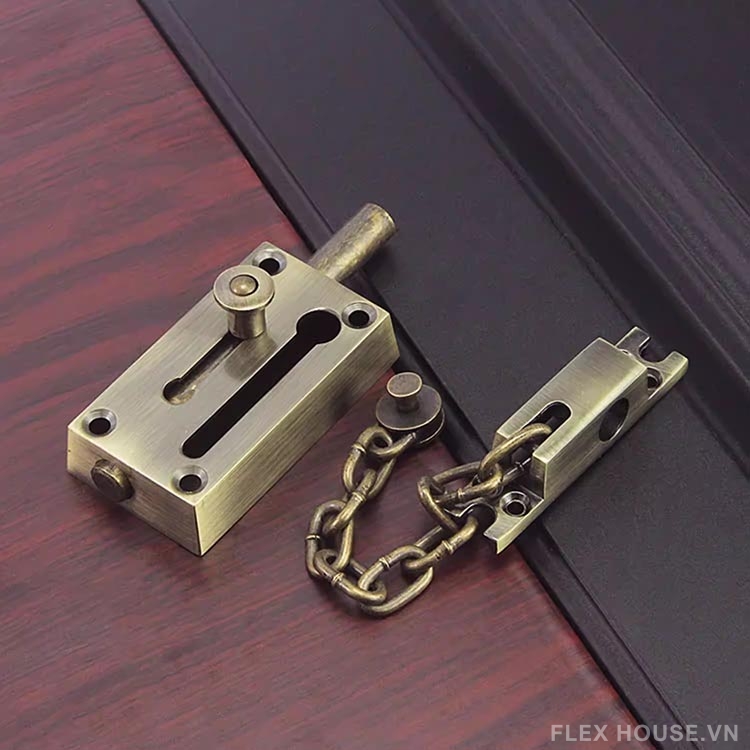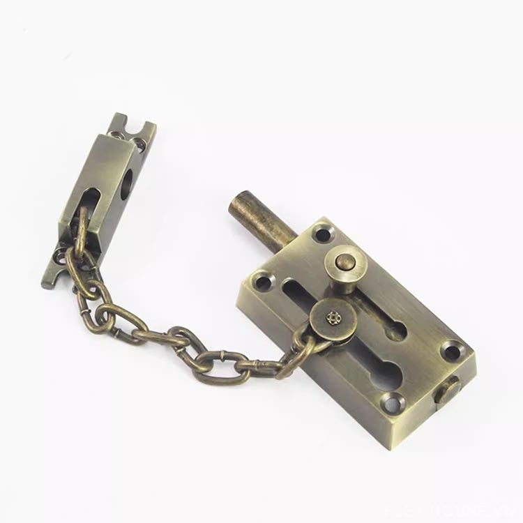 Sản phẩm khóa chốt nổi bật với phong cách cổ điển sang trọng, bề mặt hoàn thiện màu giả cổ tinh tế, phù hợp với nhiều không gian nội thất từ truyền thống đến hiện đại. Cấu tạo chắc chắn cùng chất liệu kim loại cao cấp giúp khóa vận hành ổn định, bền bỉ theo thời gian.