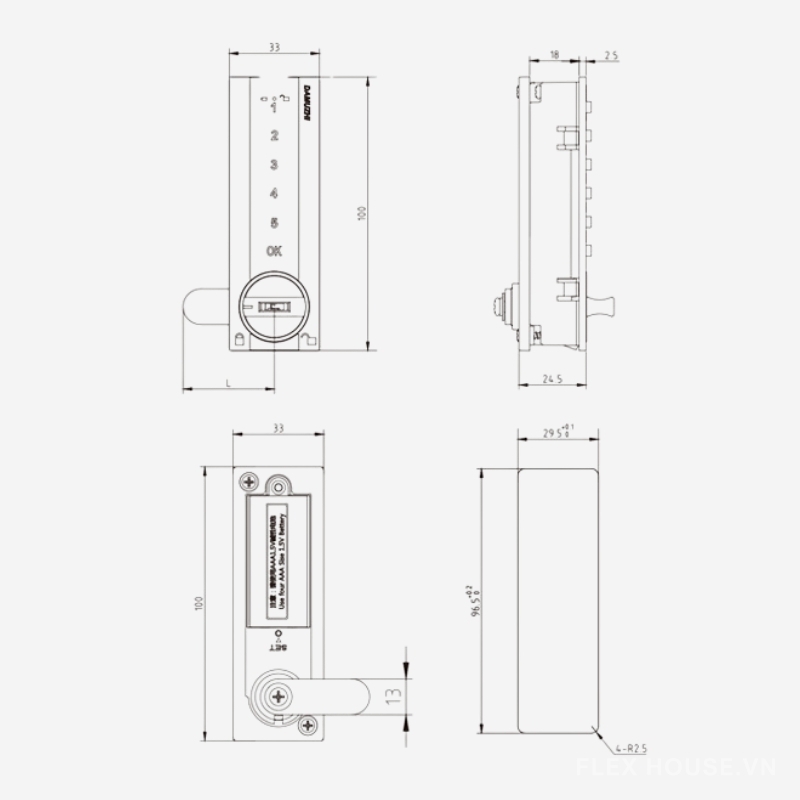 - Tiện dụng vượt trội: Dễ dàng thay pin qua nắp bên ngoài, dùng 2 viên pin AAA. Thiết kế cơ khí chống quên mật mã, sử dụng khóa khẩn (wave-style cam) để mở khi cần thiết.