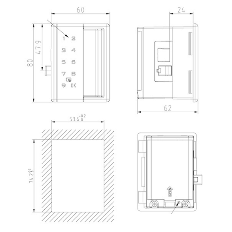| Lỗ khoan lắp đặt | Theo bản vẽ chuẩn 53.6 × 74.2 mm |