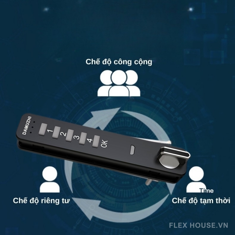 - Chế độ công cộng (Public Mode): Dùng cho phòng gym, tủ siêu thị… mỗi người tự đặt mật mã khi khóa – mở xong tự giải phóng.