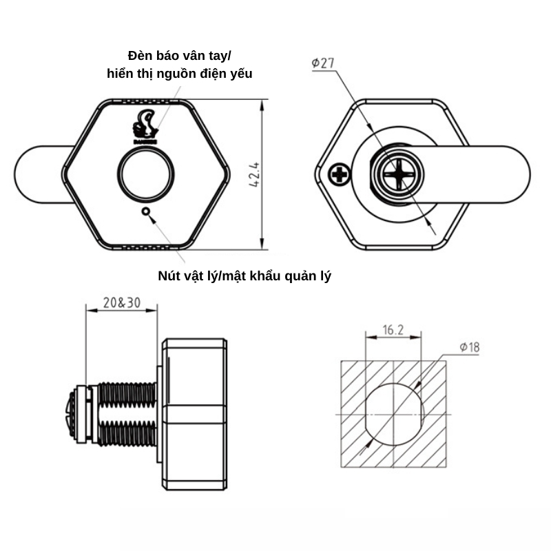 | Phương thức mở khóa | Vân tay + Bluetooth (APP) |