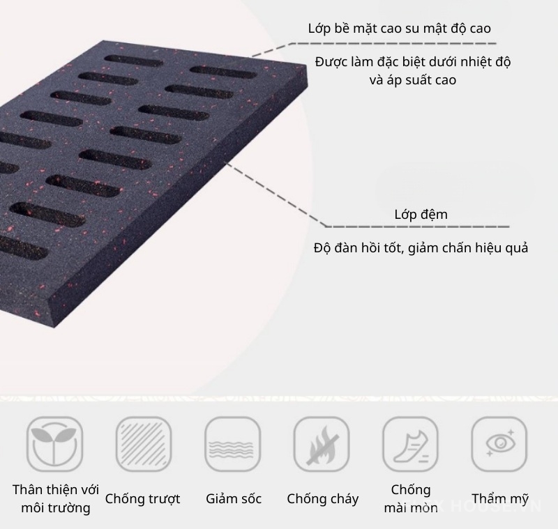 - Chất liệu: Cao su mật độ cao + hạt gia cường