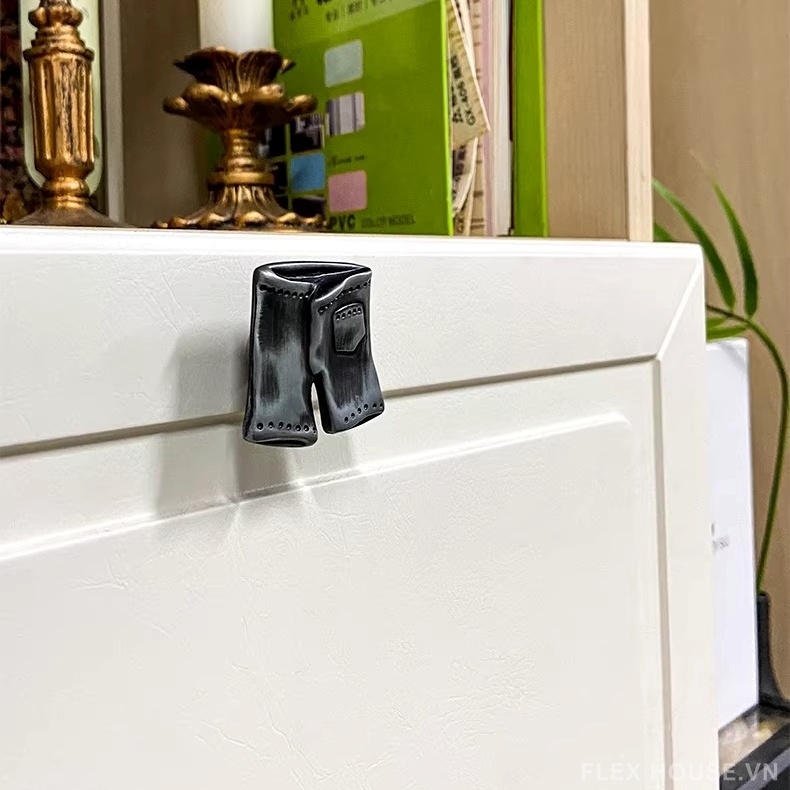 Núm tay nắm cánh tủ hợp kim hình bộ đồ JM664 mang thiết kế sáng tạo với tạo hình áo và quần cách điệu, các chi tiết viền chấm nổi tinh tế tạo cảm giác vui nhộn nhưng vẫn gọn gàng, hiện đại. Kiểu dáng độc đáo này giúp cánh tủ trở nên sinh động hơn, đặc biệt phù hợp với không gian phòng trẻ em hoặc các khu vực nội thất mang phong cách trẻ trung.