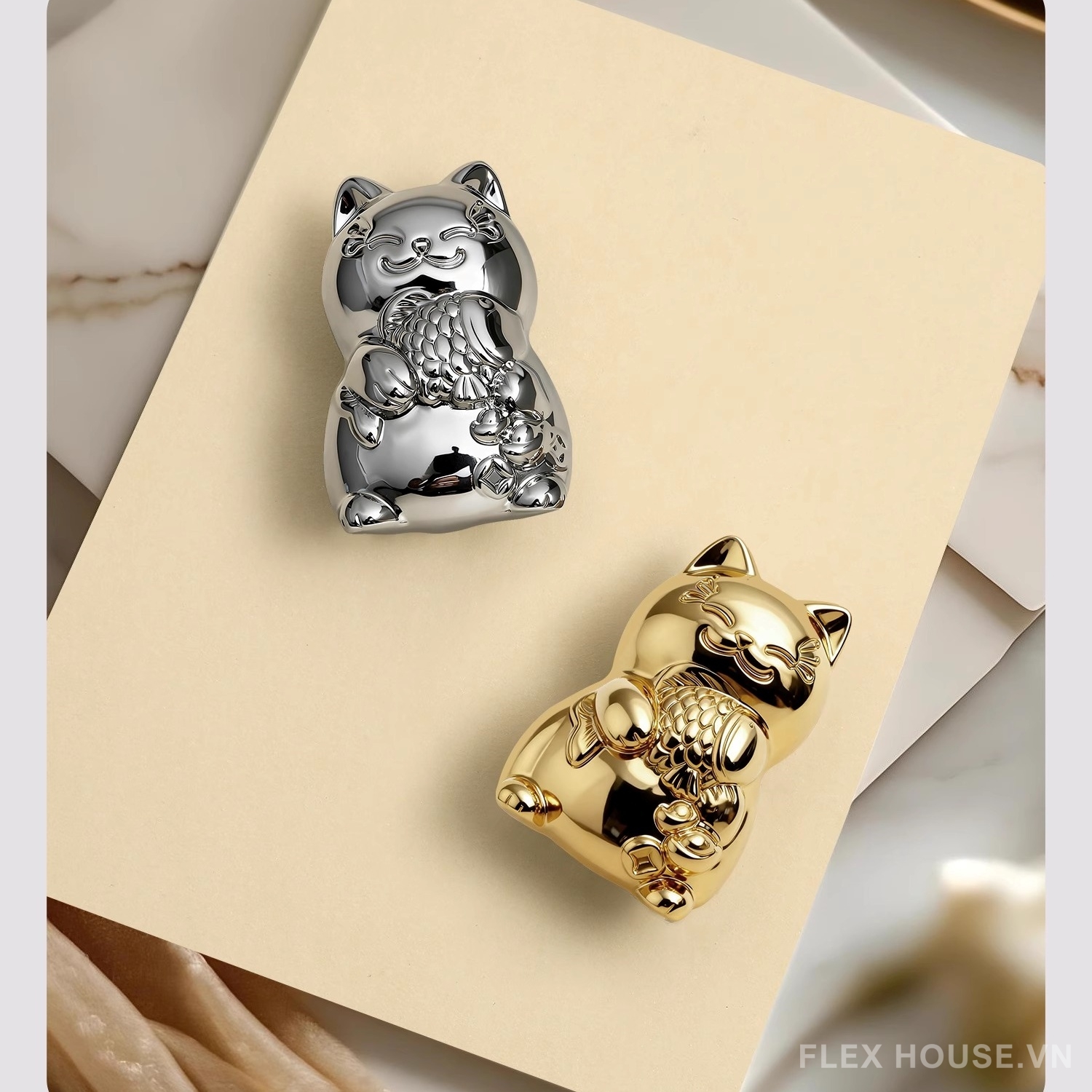 Hình tượng mèo thần tài cầm cá chép – biểu trưng cho tài lộc, thịnh vượng và may mắn dồi dào – được khắc họa mềm mại nhưng sắc nét, thể hiện giá trị thẩm mỹ cao. Chất liệu đồng thau bền bỉ giúp núm tay nắm không bị oxy hóa, không phai màu và dễ dàng vệ sinh trong quá trình sử dụng.