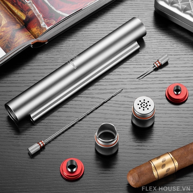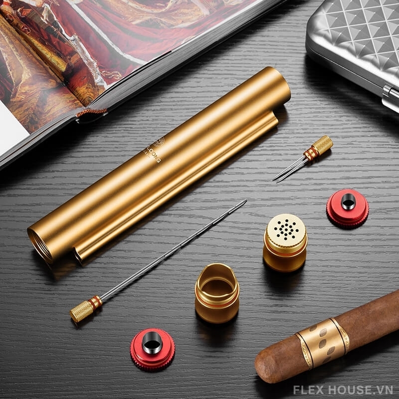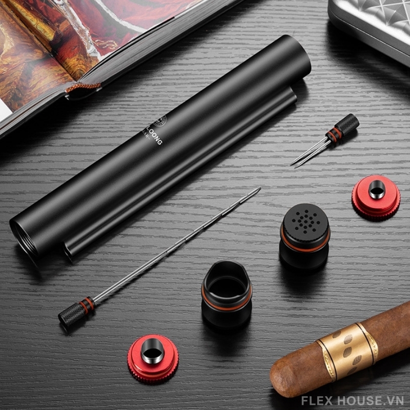 - Sản phẩm tích hợp nhiều công cụ cigar trong một thân ống nhỏ gọn gồm: ống đựng xì gà, kim thông cigar, kim chống tắc, gác xì gà, bộ đục lỗ 7mm, bộ đục lỗ 10mm và bộ tạo ẩm tiện dụng