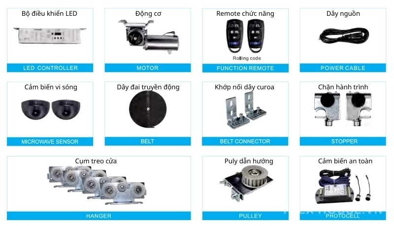 - Động cơ tải nặng 100W: Truyền động chính cho toàn bộ hệ cửa