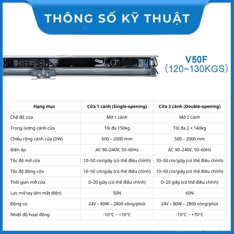 Phụ kiện cửa V50F là bộ cơ cấu cửa trượt tự động thuộc dòng thương mại, được thiết kế tối ưu cho các công trình có tần suất sử dụng cao như khách sạn, tòa nhà văn phòng, trung tâm thương mại, bệnh viện và showroom. Hệ thống sử dụng động cơ không chổi than công suất 80W, cho khả năng vận hành ổn định, bền bỉ, tải trọng lớn nhưng vẫn đảm bảo độ êm ái và an toàn trong quá trình sử dụng lâu dài.