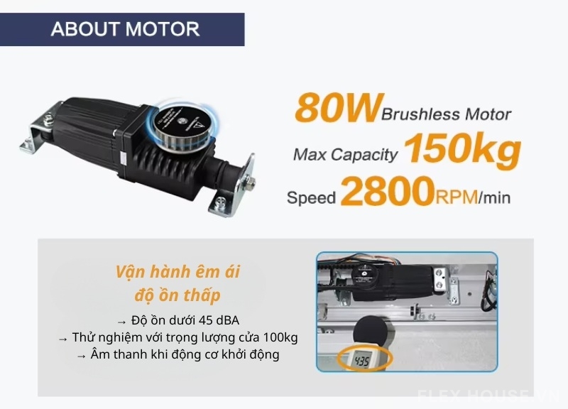 V50F sở hữu thiết kế động cơ dạng dẹt, cho phép cụm treo cửa di chuyển xuyên dưới thân động cơ, từ đó tối ưu không gian ray và đặc biệt phù hợp với các hệ cửa có bề ngang hạn chế, trần thấp hoặc yêu cầu cao về tính gọn gàng, thẩm mỹ và độ êm khi vận hành.