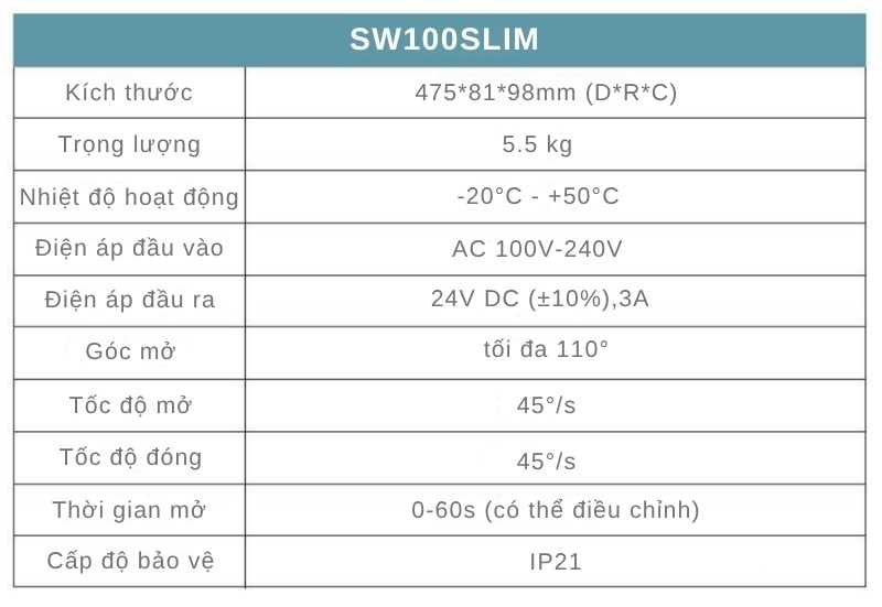 SW100SLIM không chỉ là bộ phụ kiện cửa mở cánh tự động thân mỏng, mà còn là một giải pháp toàn diện cho những công trình yêu cầu tính thẩm mỹ cao, độ ổn định lớn và khả năng vận hành an toàn tuyệt đối. Với thiết kế slim gọn gàng, bộ điều khiển – biến áp tích hợp, hỗ trợ cảm biến hai phía, khả năng kết nối khóa từ trực tiếp và tùy chọn pin Lithium khi mất điện, SW100SLIM đáp ứng hoàn hảo mọi nhu cầu từ văn phòng, bệnh viện, cửa hàng đến các dự án nhà thông minh hiện đại.
