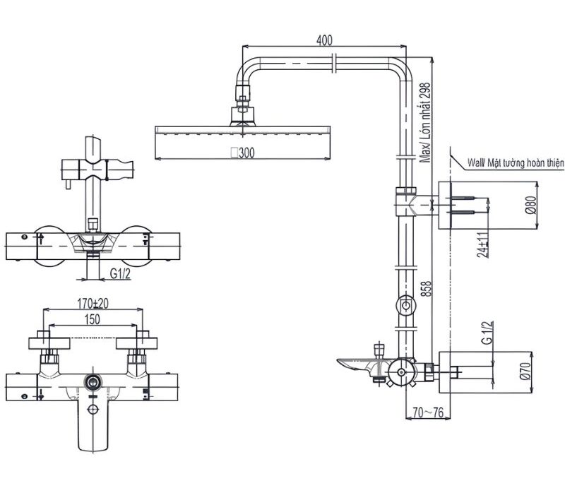 - Áp lực nước: 0.05 ~ 1.0 MPa