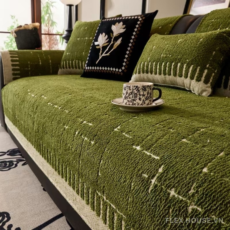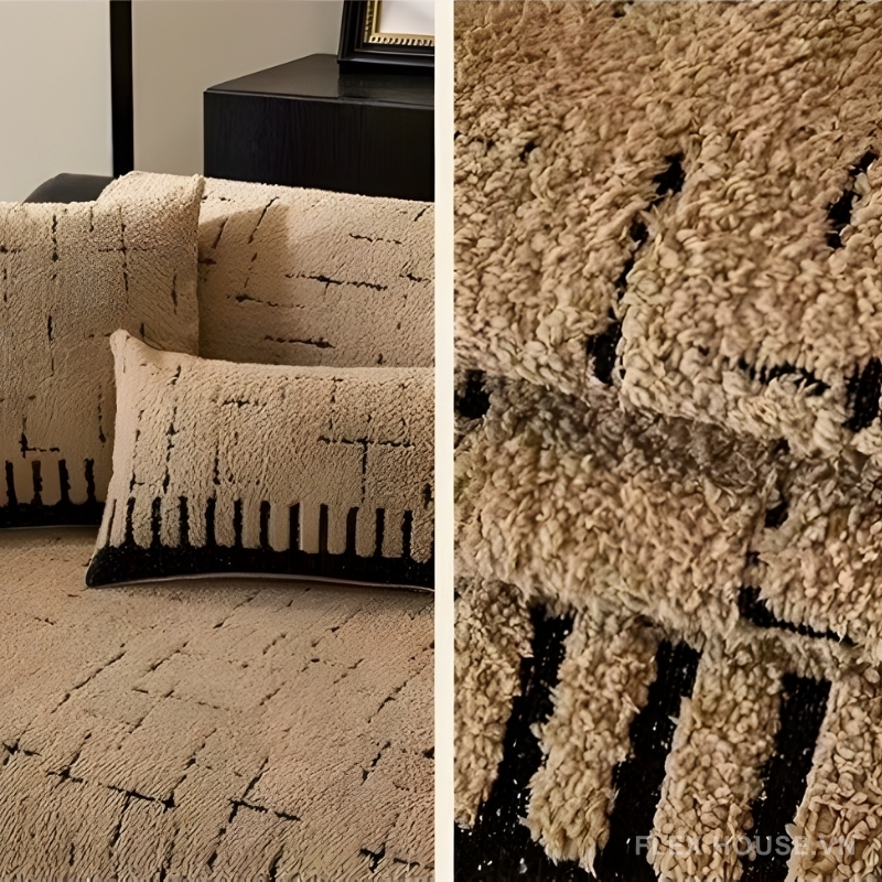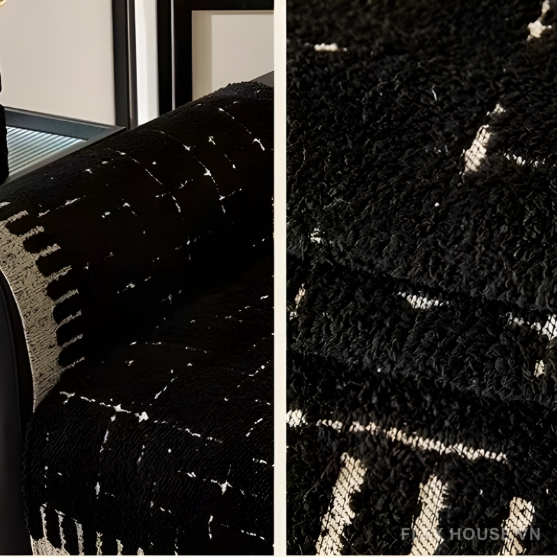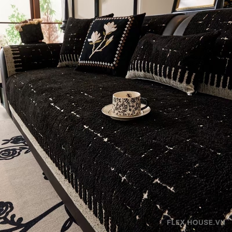 Tấm phủ ghế sofa vải lông nhung sang trọng PJ6994 mang đến cảm giác mềm mại và ấm áp vượt trội, biến phòng khách thành một không gian thư giãn đúng nghĩa. Chất liệu lông nhung dày mịn (plush) được dệt jacquard tinh xảo, cho cảm giác mềm như chạm vào lông thú nhẹ, cực kỳ dễ chịu cho mùa thu – đông. Tông màu đen, xanh lá, nâu cùng họa tiết gạch đứt quãng độc đáo tạo điểm nhấn nghệ thuật sang trọng, phù hợp không gian hiện đại, Bắc Âu hay phong cách tối giản.