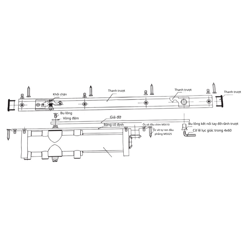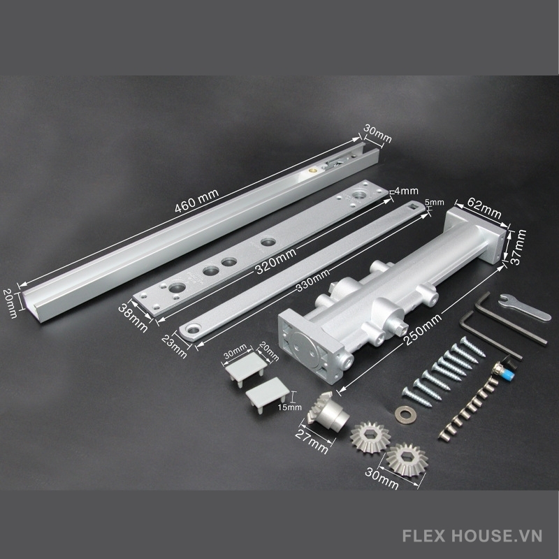 - Phụ kiện đi kèm: Thanh ray, thân tay co, ốc vít lắp đặt, phụ kiện đồng bộ