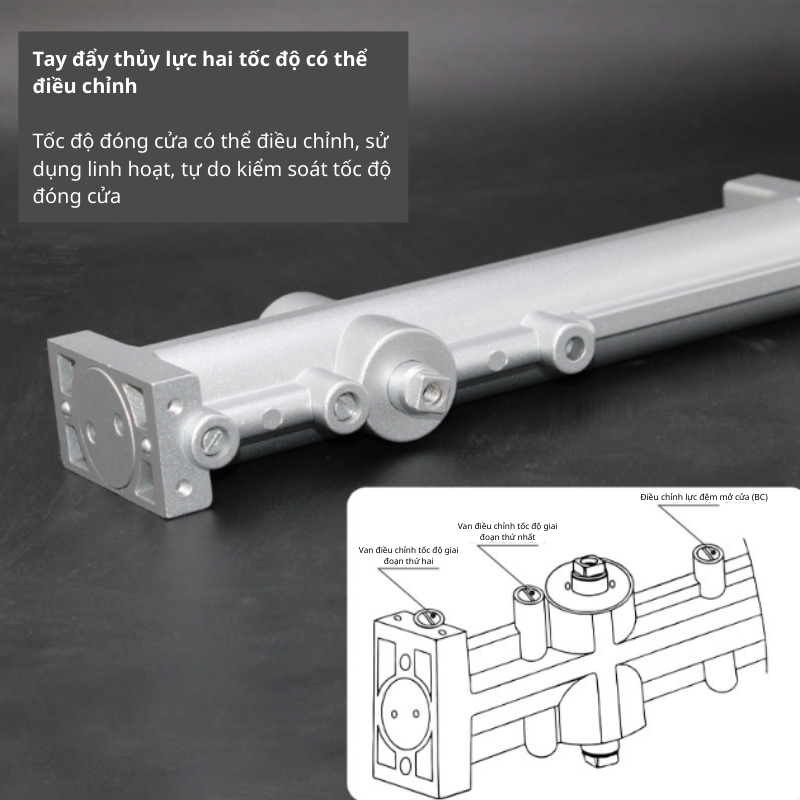 - Tốc độ đóng cửa điều chỉnh linh hoạt: Trang bị vít chỉnh độc lập, cho phép điều chỉnh tốc độ đóng và tốc độ chốt cuối theo nhu cầu thực tế của từng loại cửa.