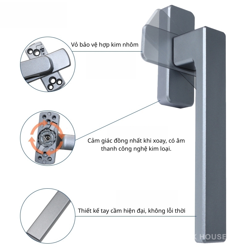 Sản phẩm có 2 phiên bản tay thẳng và tay lệch, không phân biệt hướng trái/phải, dễ dàng lắp đặt và thay thế cho nhiều loại cửa sổ nhôm khác nhau.
