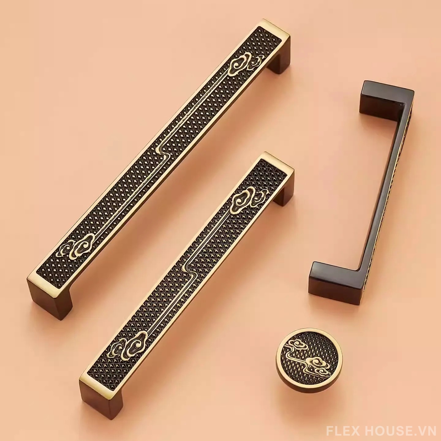 Tay nắm tủ bằng đồng thau vân mây Như Ý HK047CB là mẫu phụ kiện nội thất mang đậm tinh thần Á Đông cao cấp, kết hợp hài hòa giữa yếu tố phong thủy truyền thống và ngôn ngữ thiết kế hiện đại. Họa tiết vân mây Như Ý uốn lượn mềm mại trên nền bề mặt dập vân hình học, tượng trưng cho cát tường – may mắn – hanh thông, tạo điểm nhấn giàu ý nghĩa cho không gian sống.