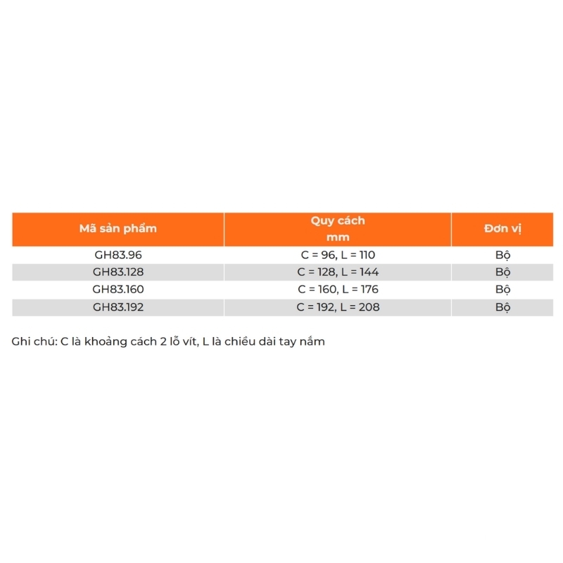 | Khoảng cách lỗ vít (C) | 96 mm / 128 mm / 160 mm / 192 mm |