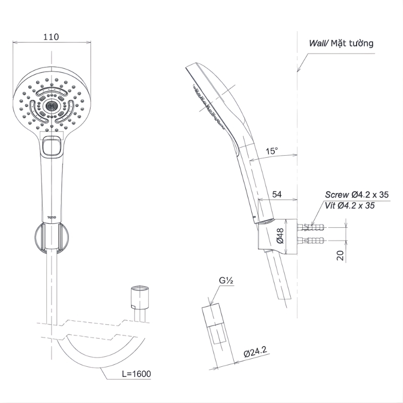 - Áp lực nước: 0.05 – 0.8MPa