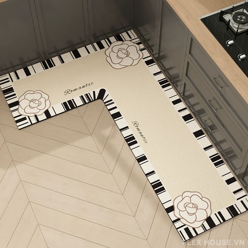 Thảm bếp HY9865 mang đậm dấu ấn French Chic – Romantic style với sự kết hợp độc đáo giữa họa tiết hoa trà mềm mại và viền phím đàn piano nghệ thuật. Tổng thể thiết kế vừa thanh lịch, vừa có điểm nhấn sáng tạo, giúp không gian bếp trở nên tinh tế và đầy cảm hứng như một góc Paris thu nhỏ.