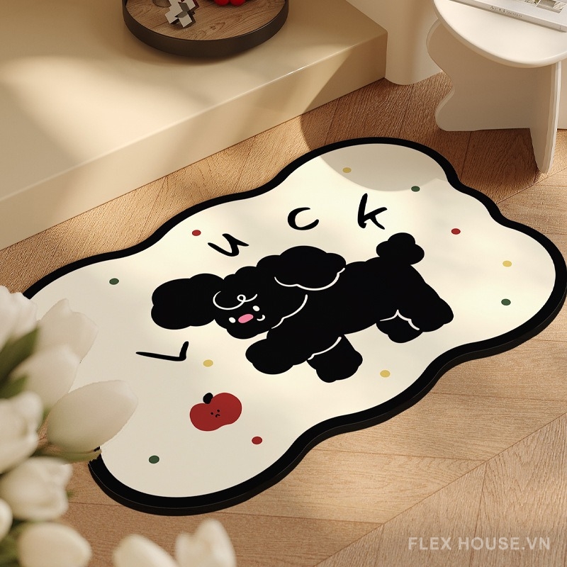 Mang hơi thở tươi mới và năng lượng tích cực vào không gian phòng tắm của bạn với thảm phòng tắm chống trượt XF6860, gây ấn tượng với họa tiết chó Poodle đen đáng yêu cùng mèo Miao tinh nghịch trên nền trắng kem điểm xuyết chấm bi màu pastel – vừa trẻ trung vừa sang trọng nhẹ nhàng.
