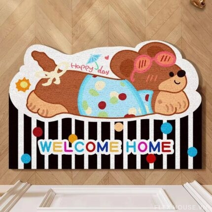 Thảm chùi chân JX0194 nổi bật với hình ảnh chú chó nằm dài thư giãn, tạo hình bo tròn mềm mại như một nét vẽ tay ngộ nghĩnh. Phong cách Cartoon Art hiện đại, kết hợp họa tiết chấm bi – sọc đen trắng – màu pastel tươi sáng, mang lại cảm giác vui vẻ, thân thiện và rất “welcome” ngay từ lối vào nhà.