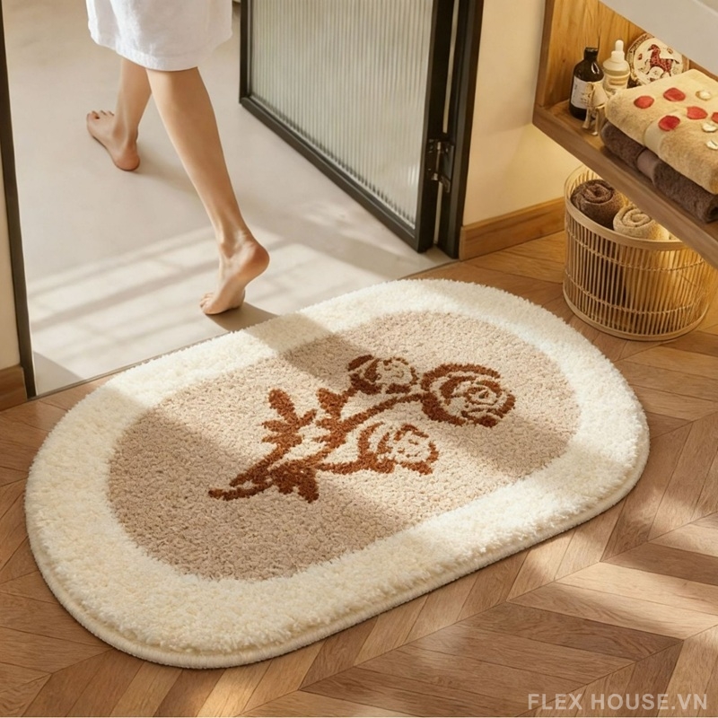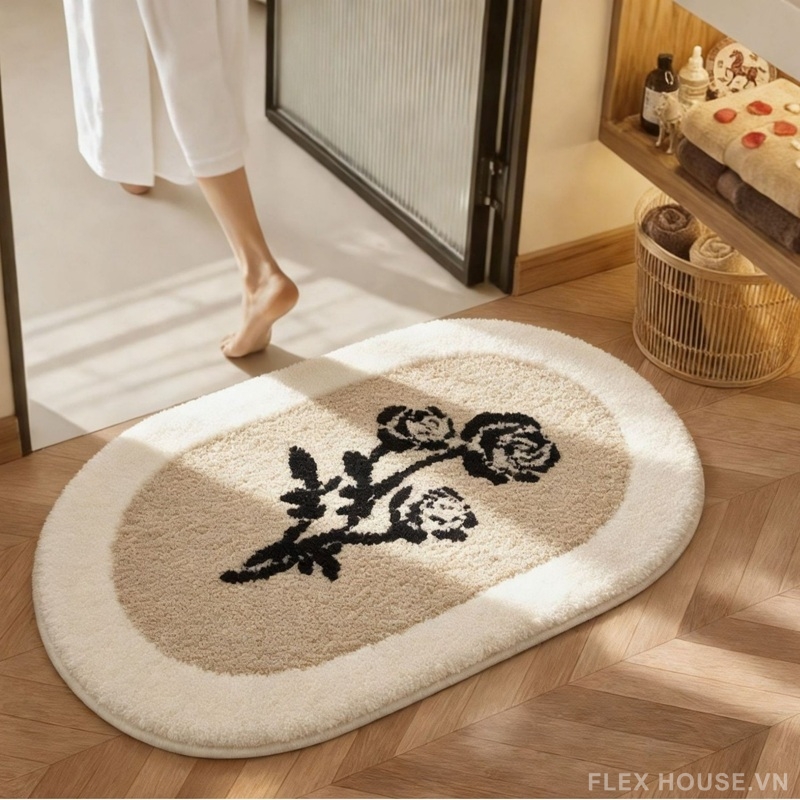 Lấy cảm hứng từ hoa văn thực vật cổ điển trong nội thất Mỹ, thảm lông JX1724 nổi bật với họa tiết nhành hoa mềm mại trên nền oval thanh lịch. Tông màu kem – nâu trầm (hoặc đen) gợi cảm giác ấm áp, sang trọng, dễ dàng hòa hợp với không gian từ phòng tắm, cửa ra vào đến ban công đầy nắng.