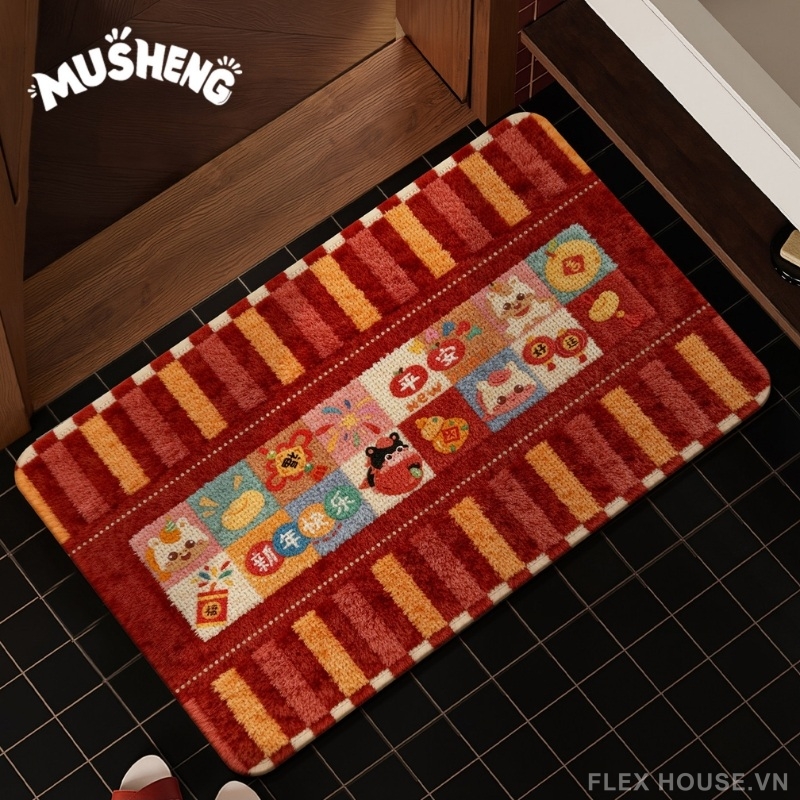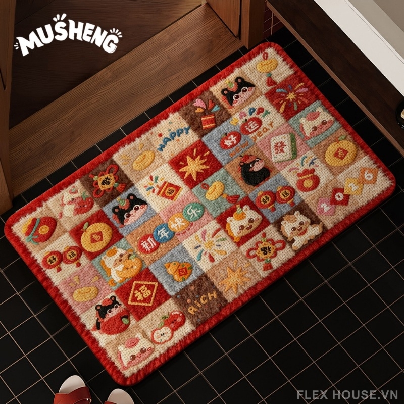 Rực rỡ sắc đỏ may mắn cùng bộ sưu tập họa tiết linh vật – pháo hoa – đồng tiền – câu chúc năm mới, thảm tảo cát XF2630 mang trọn tinh thần lễ hội và thông điệp phát tài ngay từ ánh nhìn đầu tiên. Thiết kế dạng mosaic ô vuông sinh động tạo cảm giác vui tươi, ấm áp, cực kỳ phù hợp trang trí cửa ra vào dịp Tết hoặc quanh năm cho gia chủ yêu thích phong cách phong thủy.