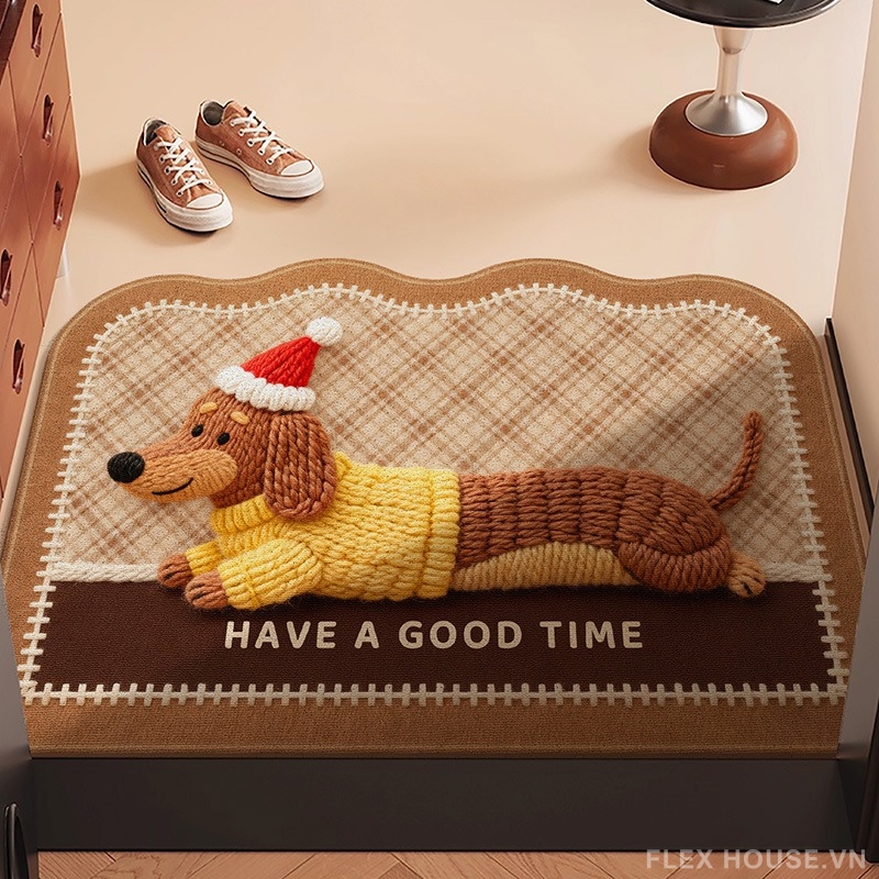 Thảm lau chân YY2266 mang phong cách cartoon len dệt kết hợp không khí lễ hội, nổi bật với hình ảnh chó dachshund dáng dài đội mũ Noel vô cùng ngộ nghĩnh. Gam màu nâu – be trung tính phối họa tiết caro nhẹ tạo cảm giác ấm áp, thân thiện, phù hợp trang trí cửa nhà dịp cuối năm, Giáng Sinh và Tết.