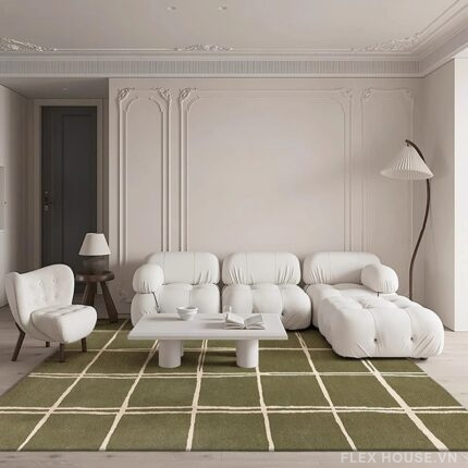 Bề mặt thảm sử dụng vải giả cashmere cao cấp, dệt mật độ cao cho cảm giác êm ái, mịn màng và thân thiện với da. Kết hợp cùng bảng màu trung tính – xanh rêu, be, nâu đất, vàng mustard, xanh navy – thảm trải sàn SH4553 dễ dàng hòa hợp với nhiều phong cách decor từ Scandinavian, Minimalism đến Modern Contemporary.