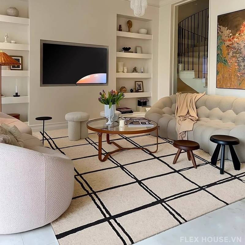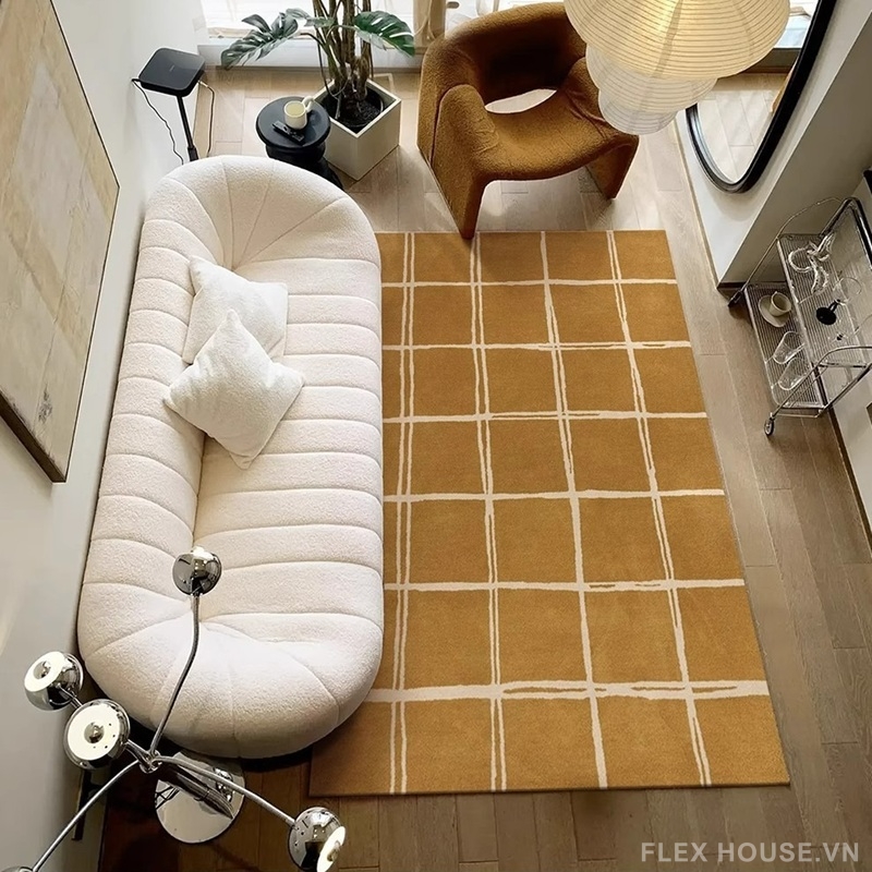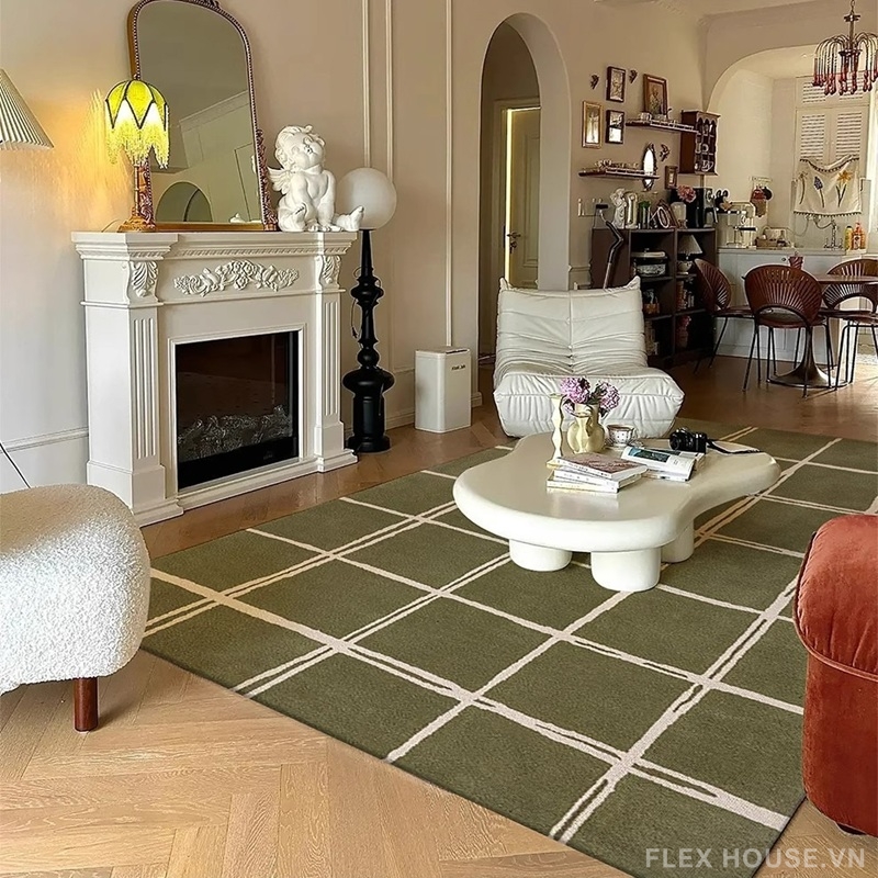 Bề mặt thảm sử dụng vải giả cashmere cao cấp, dệt mật độ cao cho cảm giác êm ái, mịn màng và thân thiện với da. Kết hợp cùng bảng màu trung tính – xanh rêu, be, nâu đất, vàng mustard, xanh navy – thảm trải sàn SH4553 dễ dàng hòa hợp với nhiều phong cách decor từ Scandinavian, Minimalism đến Modern Contemporary.