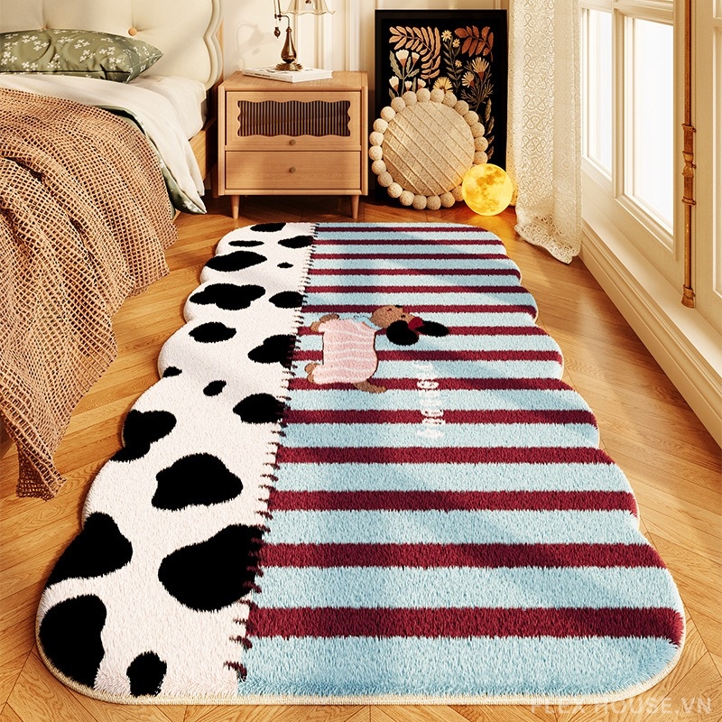 Thảm lông ngắn YY6915 gây ấn tượng ngay từ cái nhìn đầu tiên với thiết kế nửa đối xứng độc đáo: một bên là họa tiết bò sữa phá cách, một bên là các dải màu pastel dịu mắt kết hợp minh họa nhân vật đáng yêu. Tổng thể mang tinh thần Playful Art hiện đại – vừa nghệ thuật, vừa gần gũi, tạo điểm nhấn sinh động cho không gian sống.